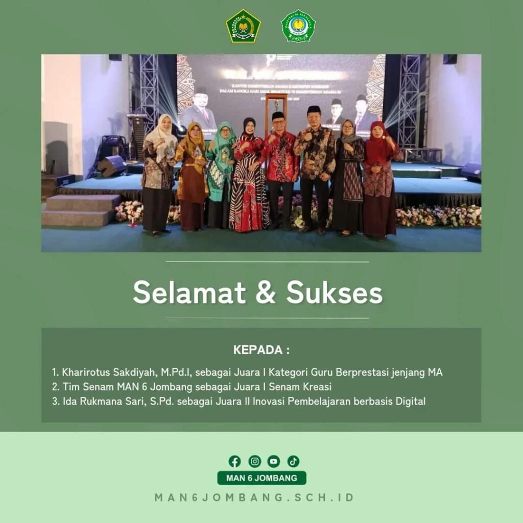 Dengan dasar motto Madrasah Berdaya Saing seluruh Civitas Akademika MAN 6 Jombang Terus berpacu mengukir Prestasi baik dalam kancah regional maupun Nasional. kali ini dalam Malam Anugerah Kantor Kementerian Agama Kabupaten Jombang dalam rangka hari Aman Bhakti ke-78 Kementerian Agama Republik Indonesia, kegiatan yang dilaksanakan di Aula KH. Aula KH. Hasyim Asy’ari MAN 4 Jombang Jl. KH. Bisri Syansuri No. 21 Jombang hari Jumat tanggal 5 Januari 2024 ini mengakomodir kompetensi baik dari Peserta Didik maupun Tenega Kependidikan serta inovasi Pembelajaran an Kepala Satuan Pendidikan Berprestasi serta berbagai olahraga dan Seni. Dalam amanatnya waktu memberikan sambutan Drs. Muhajir, M.Pd.I yang juga sekaligus Kepala Kantor Kementerian Agama Kabupaten Jombang Dengan daya Dukung sebagai Kementerian Agama dengan Jumlah ASN 1400san (terbanyak Se Jawa Timur) maka Jombang harus bisa memanfaatkan daya dukung kwantitas tersebut menuju Kualitas ASN yang mumpuni dan bisa diandalkan dalam setiap bidang spesifikasinya. Beliau juga menyampaikan gagasan diadakannya jombang madrasah competition ( JMC) sebagai embrio untuk mencetak Juara pada pelaksanaan KSM di Jawa Timur maupun Nasional. Dalam Malam Anugerah Kantor Kementerian Agama Kabupaten Jombang dalam rangka hari Aman Bhakti ke-78 tersebut yang dihadiri oleh Seluruh perwakilan MI,MTs,MA Negeri maupun Swasta sampai KUA Se Kabupaten Jombang, MAN 6 Jombang berhasil menyabet 3 Kategori Sekaligus Mulai dari Juara 1 Guru dan Tenaga Kependidikan tingkat MA yang diraih Oleh Ibu Kharirotus Sakdiyah, M.Pd.I dan Juara 2 Inovasi Pembelajaran berbasis IT tingkat MA yang diraih oleh Miss Ida Rukmana Sari, S.Pd, Wanita yang akrab disapa Miss ida Ini mengangkat inovasi yang dikemas dalam bingkai Website Enjoy (English Joy) sebuah inovasi pembelajaran berbasis digital. Melalui website ini, siswa dapat melakukan absensi secara real-time dengan foto, tanda tangan, dan lokasi terkini, menjadikan proses administrasi lebih efisien. Jurnal kelas online memungkinkan siswa, guru, dan orang tua untuk melihat perkembangan belajar secara transparan. Tidak hanya itu, terdapat pula report card yang memungkinkan siswa mengecek nilai bahasa Inggris mereka secara berkala, sementara portofolio mengumpulkan karya-karya siswa sebagai bentuk apresiasi atas prestasi mereka. Fitur kontak guru memudahkan siswa dalam mengatasi kesulitan, menjadikan komunikasi antara guru dan siswa lebih terbuka. Tidak lupa, pendekatan gamifikasi dengan worksheet berbentuk game menjadikan pembelajaran lebih menarik dan interaktif. Inovasi ini tidak hanya menciptakan lingkungan pembelajaran yang efektif tetapi juga memberikan pengalaman belajar yang menyenangkan bagi siswa. Di Bidang Seni MAN 6 Jombang juga meraih Juara 1 Senam Kreasi dengan ketua tim yang digawangi oleh Ibu Tatik Indarwati, S.Sos.I, M.Pd.I. Di jenjang Siswa MAN 6 Jombang juga mengukir tinta Emas dengan masuknya ananda Salwa Nabilatus Hisanah Juara Harapan 2 Lomba Mapel Fisika Terintegrasi Jenang MA dan Alwiyatul Salwa Armadani Sebagai Juara Harapan 3 Mapel Ekonomi Terintegrasi jenjang MA, di kompetisi yang lain juga tidak mau kalah 10 Besar Ananda Alfin Hidayatulloh dalam penyusunan lomba Esay Festival Ilmiah Santri 2024 tingkat nasional di STAIMA Al Hikam Malang. Dalam kesempatan yang sama masih dalam rangkaian malam Anugerah Kantor Kementerian Agama Kabupaten Jombang dalam rangka hari Aman Bhakti ke-78 Kemenag RI ini Masrukhin, S.Ag, M.Pd.I yang juga sebagai Ro’isul Madrasah MAN 6 Jombang menyampaikan tekadnya untuk membuat progres yang signifikan untuk MAN 6 Jombang dari segi prestasi baik Prestasi Lembaga, Guru maupun peserta didiknya dalam bingkai Resolusi 2024 MAN 6 Jombang. Beliau menjanjikan format Madrasah yang humanis dan akseleratif dlam konten rosulusi tersebut, ulas Pria ang sehari-harinya sebagai ketua PC Lembaga Pendidikan Ma’arif NU Kabupaten Jombang ini (5/1).