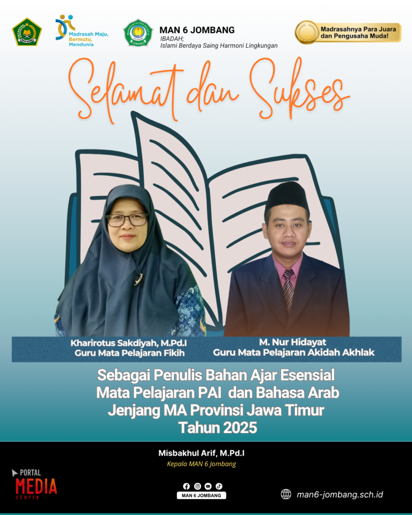 Jombang,11/10/2025 — Dua guru MAN 6 Jombang, Kharirotus Sakdiyah, M.Pd.I (guru Fikih) dan M. Nur Hidayat, M.Pd.I (guru Akidah Akhlak), dinyatakan lolos seleksi sebagai Calon Penulis Buku Materi Esensial PAI dan Bahasa Arab untuk jenjang Madrasah Aliyah tingkat Provinsi Jawa Timur Tahun 2025.