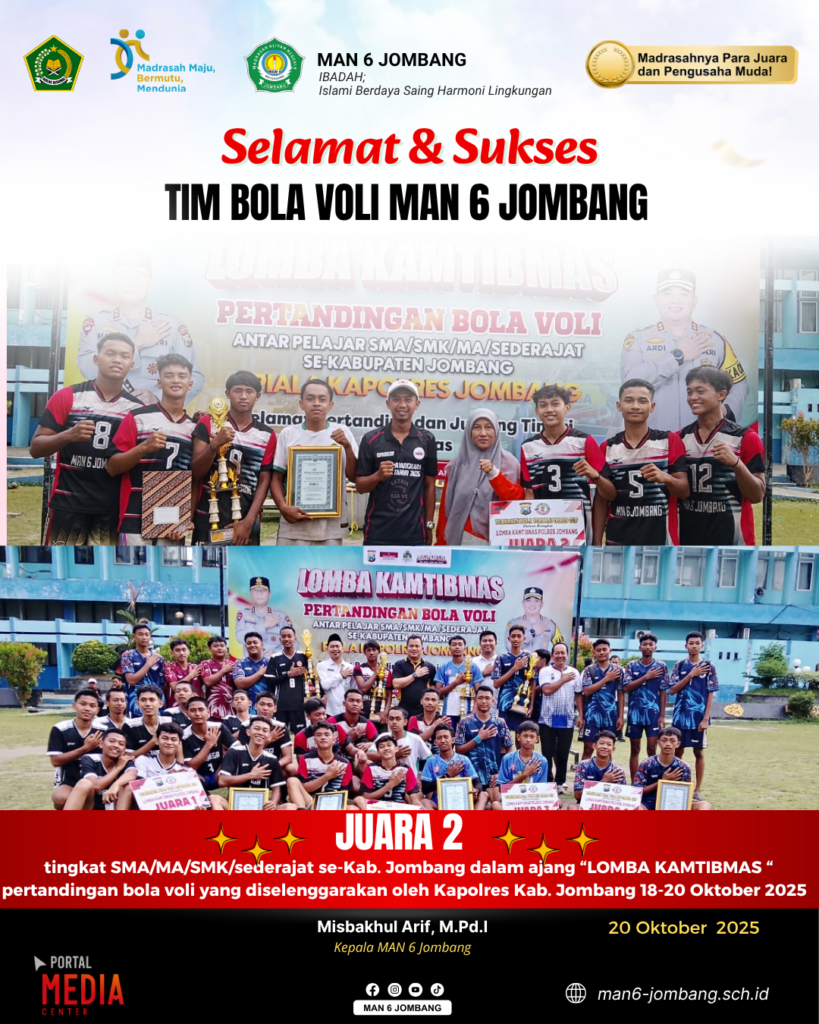 Jombang, 20 Oktober 2025 — Prestasi membanggakan kembali diraih oleh peserta didik MAN 6 Jombang. Tim voli putra madrasah ini berhasil meraih Juara II dalam ajang Lomba KANTIBMAS yang diselenggarakan oleh Kapolres Jombang pada tanggal 18–20 Oktober 2025.