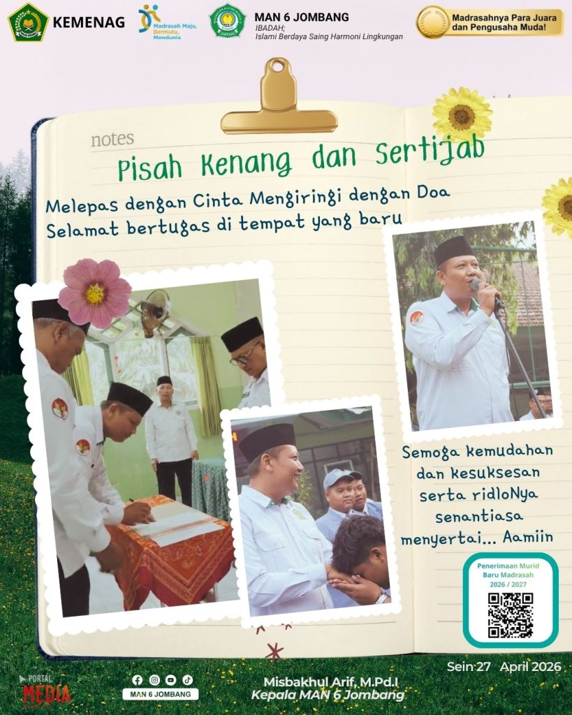 Jombang-27/4/2026 — Suasana haru dan penuh penghormatan menyelimuti rangkaian acara pisah kenang dan serah terima jabatan (sertijab) Kepala MTsN 18 Jombang yang dilaksanakan pada hari ini. Kegiatan ini menandai berakhirnya masa tugas Bapak Agus Arif, M.M.Pd sebagai guru MAN 6 Jombang menjadi Kepala MTsN 18 Jombang.
